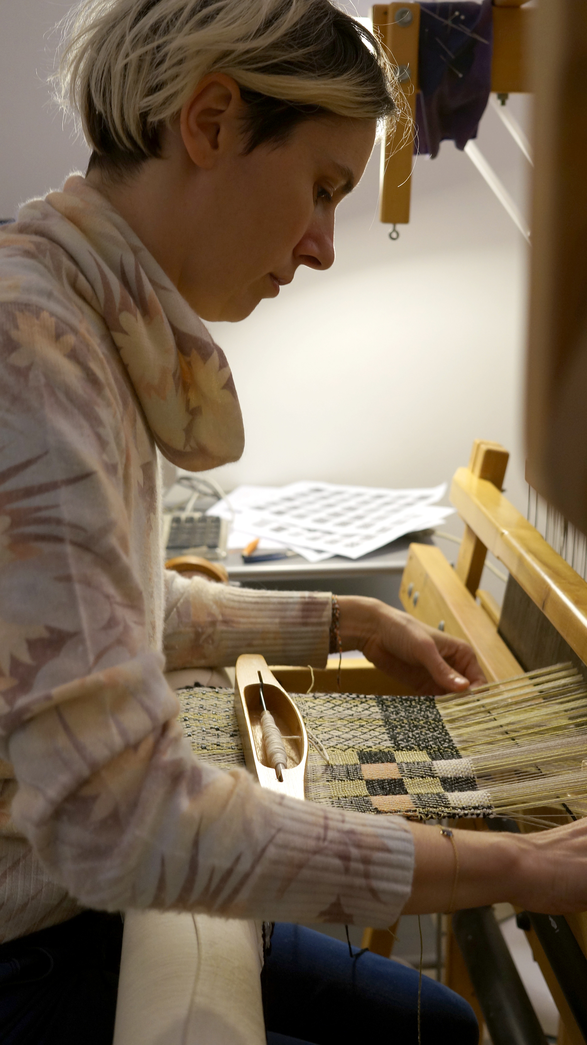 Sculpture textile en tissage, réalisée sur un métier à tisser 16 cadres à l'atelier du Haut Anjou.